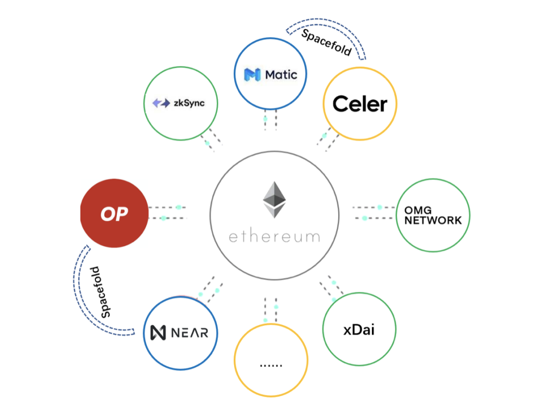 状态通道方案提供商 Connext 由于无法在 Layer 2 支持智能合约以及提供清晰的全局账本,转而开发了 Spacefold,为支持 EVM 的 Layer 2 侧链间 ERC20 转账提供解决方案。这一设计在不同侧链间假设状态通道,打破了这一赛道激烈的竞争格局,而使得不同侧链可以像不同分片一样被容纳到更广阔的网络之中。